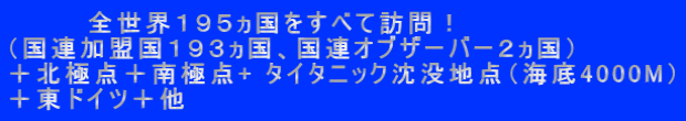 タイタニック爆縮事故に関する私のテレビインタビュー(2023) リンク 世界の写真を追加更新 (各国の写真をクリックして写真アルバムにジャンプ) リンク (ボリビア、ブラジル、チリ、ベネズエラ、中国、台湾、チベット) 南極大陸へ行き、皇帝ペンギン生息地を冒険(2022年11月27日ー12月4日) 写真・ビデオ ニューカレドニアでブラックマンタと泳ぐ (2023年2月15日26日) 写真・ビデオ 米国サンフランシスコでサイン会!!初の開催 2016年2月13日土曜日午後4時、サンフランシスコ紀伊国屋にて、私の自著「地球3第冒険紀行」のサイン会&トークショーが開催されました。詳細 マダガスカルのキツネザル 詳細 第9回ICAS学会 (アジア研究の国際会議として最大規模)で発表した論文の紹介。論文のタイトル:オーストラリア潜水艦計画ー日豪米に秘策があるのか? 論文のスライドショー(日本語) (英語)、論文発表ビデオ(英語) 詳細は、ここをクリック 「地球3大冒険紀行」を贈呈させていただきました 裏千家玄室大宗匠 在豪日本大使館大使 善行会から表彰されました(国際貢献部門) 写真 表彰状 掲載記事 キリマンジェロの頂上に到着! (アフリカ大陸最高峰 約6000メートル) 頂上到着証明書 写真 モルディブでジャイアント・マンタと遭遇 ビデオ 写真 4300メートルからスカイダイビング 証明書 ビデオ 260メートルからスカイジャンプ (ラスベガスの夜空から舞い降りる) 写真 証明書 ビデオ 北朝鮮を訪問! ビデオ タインウェイ&サンズピアノ工場視察 (ドイツ(ハンブルグ) 写真 ビデオ オーストラリアのシドニーにあるImaxシアターで、私のタイタニック沈没地点到達の記録が紹介されました 記事1 記事2 茶道裏千家から茶名を授与 華道古流から師範を授与 過去のテレビ出演・雑誌掲載 はなまるマーケット(TBS) ものしり一夜づけ(NHK) 週刊新潮 蔵衛門ソフト 美女とヤジ馬(埼玉テレビ) 超人大陸 マザーテレサさんの名刺 マウンテンゴリラと初対面! ウガンダゴリラ訪問証明書 ルアンダゴリラ訪問証明書 写真 シドニーハーバーブリッジクライムで橋の頂上に到達 制覇する! 証明書 写真 世界東西南北に立つ ![]() 政治の世界 e大学 |